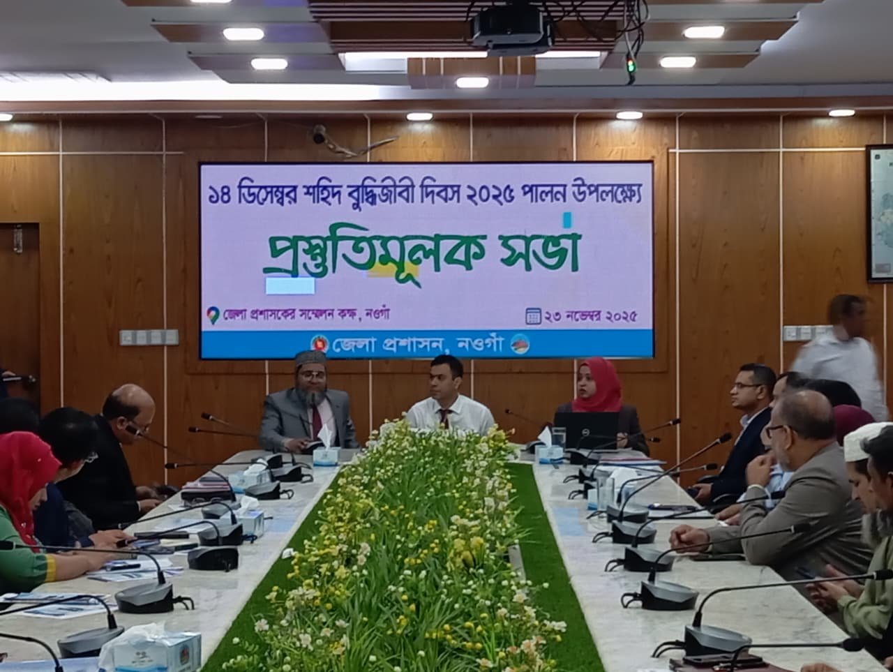 নওগাঁ জেলা প্রশাসকের সম্মেলন কক্ষে ১৪ ডিসেম্বর শহীদ বুদ্ধিজীবী দিবস ২০২৫ এবং ১৬ ডিসেম্বর মহান বিজয় দিবস পালন উপলক্ষে প্রস্তুতিমূলক সভা অনুষ্ঠিত হয়েছে। রবিবার দুপুর ১টায় অনুষ্ঠিত এ সভায় সরকারি-বেসরকারি বিভিন্ন দপ্তরের কর্মকর্তা, মুক্তিযোদ্ধা প্রতিনিধি, সাংস্কৃতিক সংগঠক, সাংবাদিক এবং জেলার ১১টি উপজেলার প্রতিনিধিরা উপস্থিত ছিলেন।